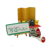 1月16日(木)10時開店です お天気は晴れ、そんなに風もなく上々です ドキドキしながら、会場の設営をしました 手作りのクローバーカフェのロゴ、新年なので金の屏風の前に5匹のネズミの縫いぐるみがお出迎えです |